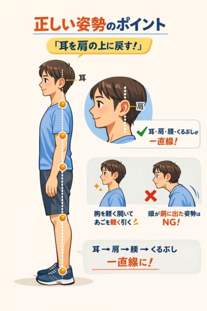 正しい姿勢では、耳・肩・股関節・くるぶしが横から見て一直線に並ぶのが理想です。特に耳の位置が重要で、耳が肩より前に出ると「頭部前方位」となり、首や肩に負担がかかります。改善のポイントは胸を軽く開き、あごを少し引いて耳を肩の上に戻す意識を持つことです。壁に背をつけて立ち、後頭部・背中・お尻が自然に壁に近づく姿勢を確認すると、正しい位置を体で覚えやすくなります。