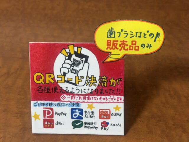 当院では 矯正歯科専門ですので 外科矯正のみ保険の患者さんです なので 現金のお支払いは少ないんですが 今回 歯ブラシや 歯間ブラシ はやりのハビットプロとかの決済が QRコードで出来るようになりました 当院の漫画家の方が作成してくれた QRコードの案内です